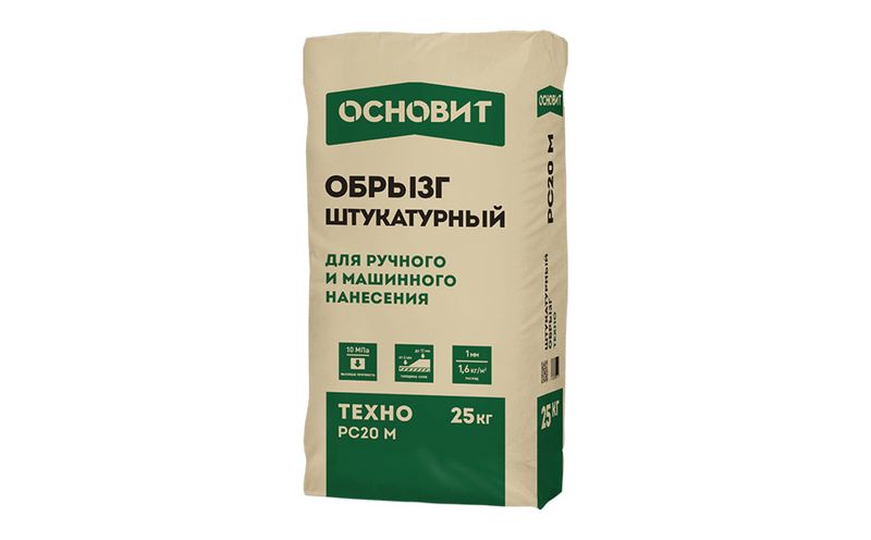 Штукатурный обрызг ОСНОВИТ ТЕХНО PC20 M машинного и ручного нанесения для предварительной обработки оснований перед нанесением выравнивающих цементных штукатурок. Создает шероховатую высокоадгезионную поверхность. Рекомендуемая толщина слоя - 4-8 мм.